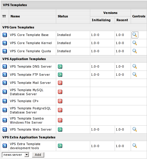 You can add VPS Templates from your user control panel. VPS template is a predefined set of RPMs to install/remove/upgrade a certain service, tool or application. You can install application (e.g dns-server, ftp-server) and extra Parallels H-Sphere VPS templates. Extra VPS template is a custom set of RPMs provided depending on your OS.