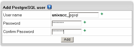 - Select PostgreSQL in the Databases menu and the Add PostgreSQL user form automatically appears.