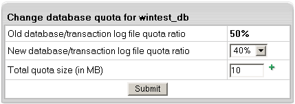 Total quota size is the disk space allocated for the database file and the transaction log file. Database/Transaction Log file quota ratio is the portion of disk space allocated for the database file. If you set the total quota size to 100 MB and the database/transaction log file quota ratio to 40%, then the maximum database file quota is 40 MB and the maximum log file quota is 60 MB. The more dynamic your database is, the bigger transaction log file quota ratio should be.